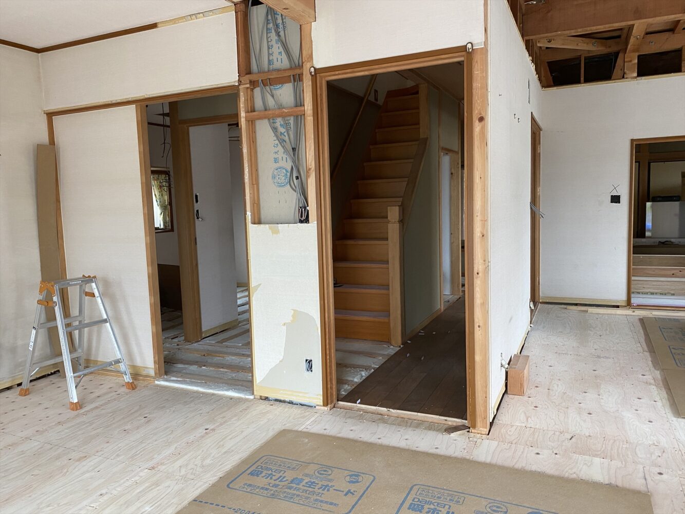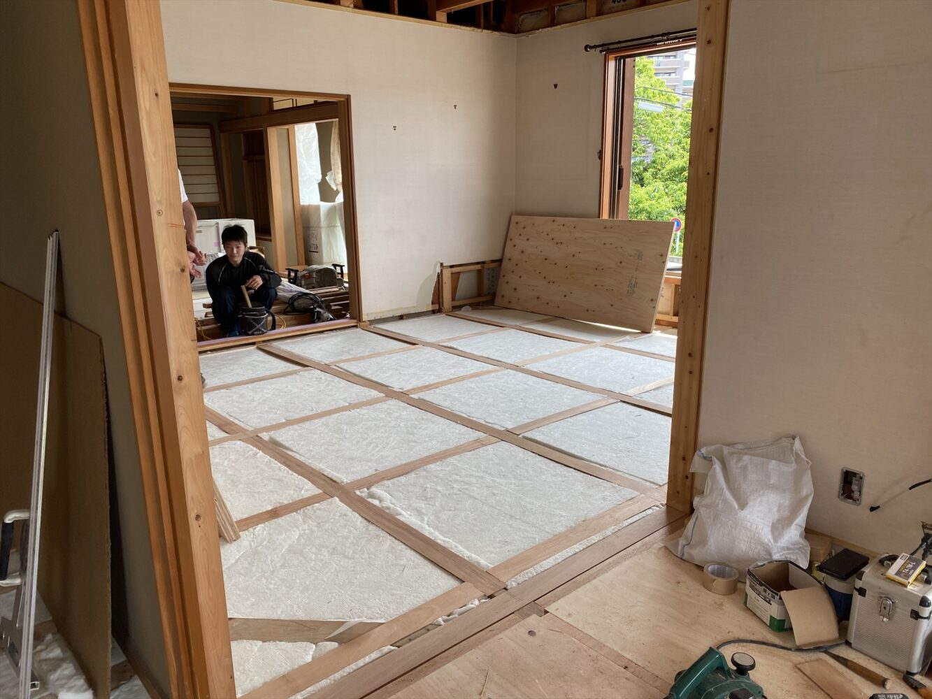 床材や建具枠を取り外し、断熱施工・捨て張り~床暖房~無垢複合フローリングと工事を進めました。