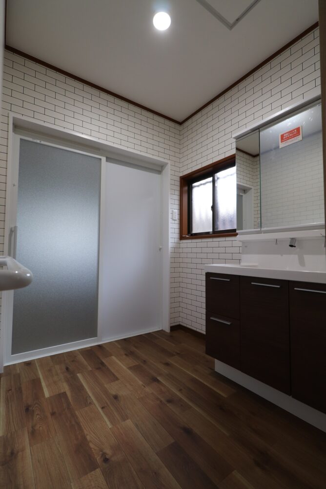 洗面・トイレの床材は周りのフローリングと似たテイストのクッションフロアで清掃性もキープ